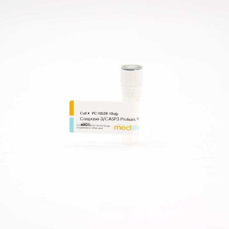 Caspase-3,半胱氨酸蛋白酶,在大肠杆菌中表达。Caspase-3/CASP3 protein is a thiol protease critical in apoptosis and is activated by initiating caspases (CASP8, CASP9 and/or CASP10). It catalyzes the cleavage of multiple proteins in sympathetic neurons, including PARP1, SREBP, caspase-6, -7 and -9, huntingtin, and RET. Caspase-3/CASP3 Protein, Human is the recombinant human-derived Caspase-3/CASP3 protein, expressed by E. coli , with tag free. The total length of Caspase-3/CASP3 Protein, Human is 248 a.a., .