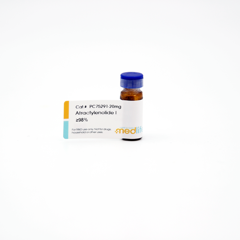 Atractylenolide I(白术内酯I,CAS 73069-13-3) 是从传统中药白术(Atractylodes macrocephala)根茎中提取的活性成分,属于倍半萜内酯类化合物。其分子式为C₁₅H₁₈O₂,分子量230.30 g/mol,纯度≥98%(HPLC验证),以白色粉末形式稳定存在,可溶于DMSO、乙酸乙酯等有机溶剂。