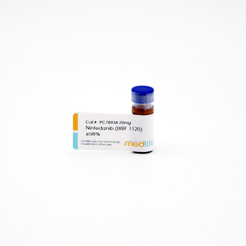 在呼吸系统疾病、肿瘤学及血管生物学研究领域,血管内皮生长因子受体(VEGFR)、血小板衍生生长因子受体(PDGFR)、成纤维细胞生长因子受体(FGFR)等酪氨酸激酶的异常激活,是导致组织纤维化、肿瘤血管生成及疾病进展的关键驱动因素。尼达尼布(Nintedanib,BIBF 1120) 作为一种强效、口服的多靶点酪氨酸激酶抑制剂,可同时抑制 VEGFR1/2/3、PDGFRα/β、FGFR1/2/3 等多个靶点(IC₅₀值均处于 nM 级别),不仅是临床治疗特发性肺纤维化(IPF)、非小细胞肺癌(NSCLC)的重要药物,更是科研人员解析纤维化发病机制、探索肿瘤血管生成调控、筛选新型干预药物的 “特异性工具”,为从基础机制研究到临床转化应用的多场景需求提供精准支持。
