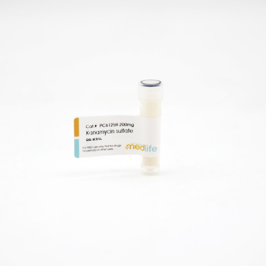 Kanamycin (Kanamycin A) sulfate 是一种口服有效的抗菌剂 (革兰氏阴性/阳性细菌),可通过与 70 S 核糖体亚单位结合,抑制转位并导致编码错误。Kanamycin sulfate 对 M. tuberculosis (敏感或耐药) 以及 K. pneumonia 均具有较好的抑制活性,可用于肺结核和肺炎的研究。Kanamycin (Kanamycin A) sulfate 是一种口服有效的抗菌剂 (革兰氏阴性/阳性细菌),可通过与 70 S 核糖体亚单位结合,抑制转位并导致编码错误。Kanamycin sulfate 对 M. tuberculosis (敏感或耐药) 以及 K. pneumonia 均具有较好的抑制活性,可用于肺结核和肺炎的研究。