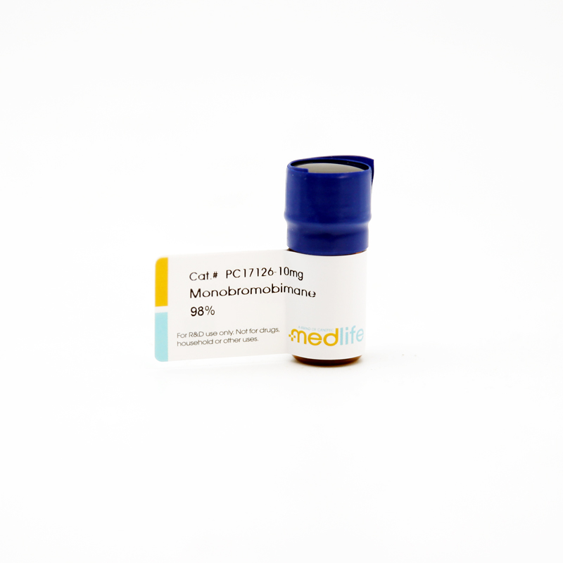 Monobromobimane(mBBr,CAS号:71418-44-5)是一种基于双吡唑并吡唑骨架的硫醇特异性荧光探针,其分子结构中含有一个溴原子作为活性位点,可与生物分子中的巯基(-SH)发生烷基化反应,生成稳定硫醚键并释放荧光信号(发射波长490 nm)。凭借其高灵敏度、细胞膜渗透性及低背景干扰特性,mBBr已成为蛋白质修饰、细胞内氧化还原状态监测及疾病标志物检测的核心工具。本文系统梳理其在蛋白质动态追踪、谷胱甘肽定量分析及神经退行性疾病研究中的前沿应用,揭示其作为“分子开关”在生命科学中的技术价值。